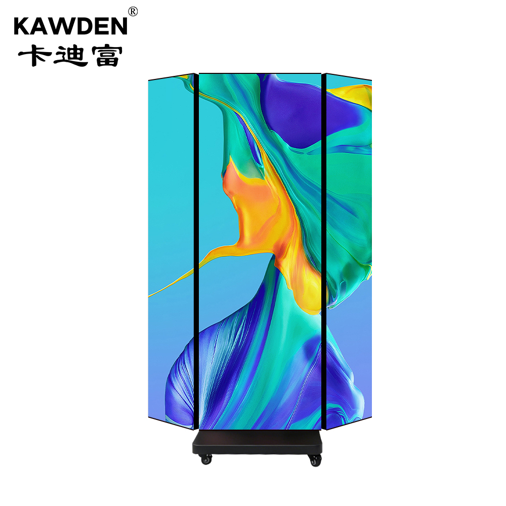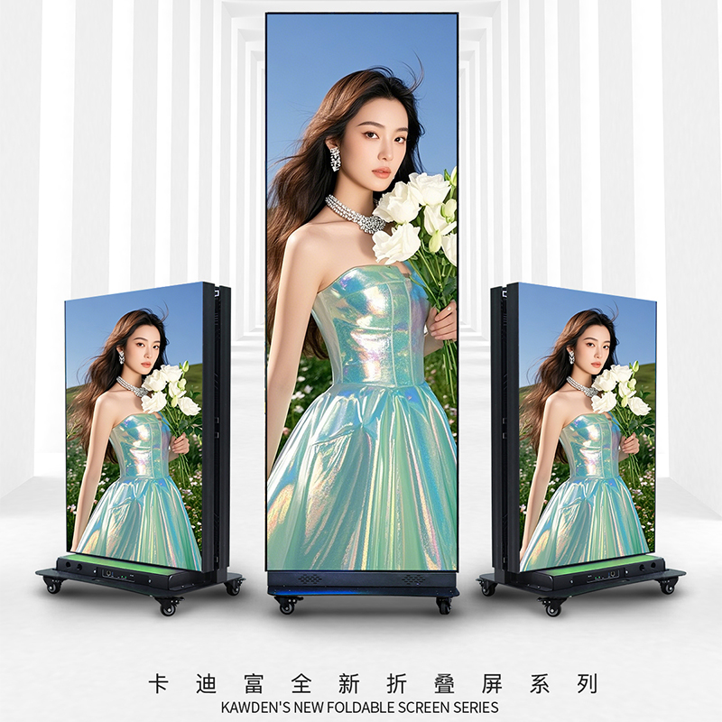 卡迪富LED三折叠双面海报屏,创新“一屏两显”设计,展开是大屏、折叠秒变双面屏,50mm 超薄航空铝机身,自...